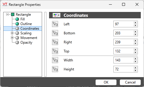 Any object can be sized or positioned using its coordinates. Dragging, stretching, or nudging an object on the page will change the values shown in the coordinates dialog. The values refer to the object's bounding box, which is always rectangular, regardless of the shape of the object.