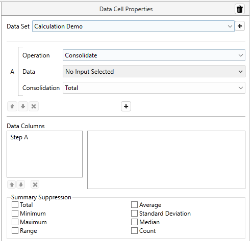 A column is added to "Data Columns" for each step you configure and displays in your report left-to-right in the same order they appear in the Data Columns list top-to-bottom. Use the arrows to change the order or use [ x ] to remove Steps that you do not wish to display in your report. Steps that are listed in Data Columns will become available in the Data drop lists of other Calculations data sets.