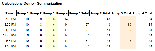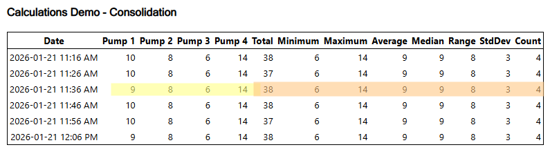 This example includes one of each of the available consolidation types. A row of equipment values from a Tag Query are highlighted in yellow. Because I added 8 calculations, there are eight additional columns displaying values calculated from the four pump values of the same row.