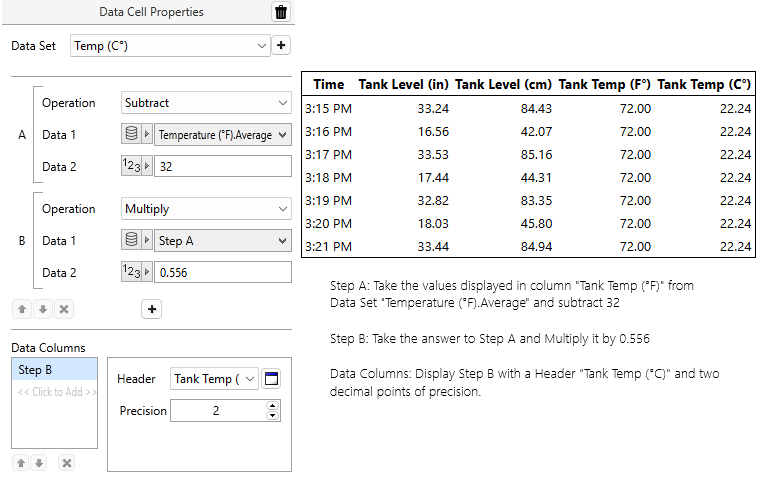 Use a Calculation Data Set to perform basic math operations to convert units. In this example, we have an I/O and Calculations tag that reads the temperature in imperial units and we want to convert to metric units for a report.