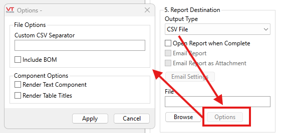 Images and line charts are not rendered in a CSV output. A file name and path must be specified before the report will run. You may automatically open the report when it's complete, email the report or click Options to open the Options dialog.