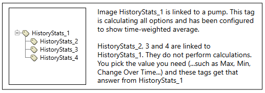 A History Statistics tag will perform all available calculations but will only display the result of 1 selected calculation. Other calculation results can be displayed without re-doing the calculation by linking new History Statistics tags to the first. Instead of all linked History Statistics tags performing calculations, the subsequent tags will just get the result from the linked History Statistics tag.