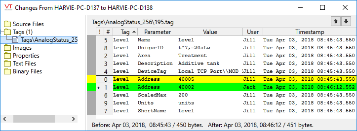 Changes that result from importing a tag file are attributed to the user who imports that tag file. See: Edit Tags Outside of VTScada