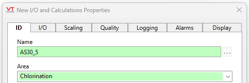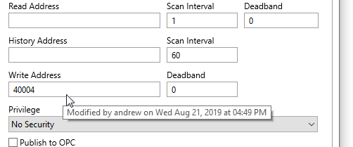 Every change to a tag's configuration is recorded in the VTScada version control system. Hover the pointer over a field to determine when the last change was made and by whom. You can easily spot fields that have been changed during the current editing session, as the background color of changed fields will turn green. The background highlight lasts only for as long as you are editing the configuration folder - each time you open a tag's configuration folder the fields will not be green, waiting for fresh changes.
