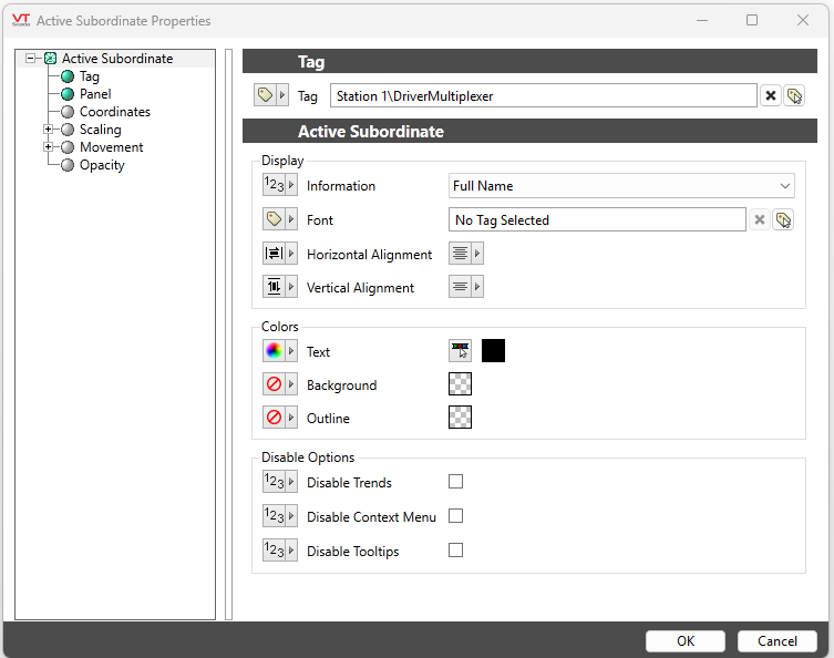 The Active Subordinate widget displays the Full Name, Short Name, or Description of the active subordinate driver tag of a Driver Multiplexer tag.