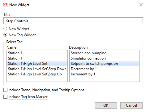 Meaning, "a button that will increase (or decrease) a value by 1". VTScada does not include a step button widget, but you can easily create your own. In addition to the widget, you'll need two Multi-Write Tags that you will create as children of the output tag for which you want to add step buttons. Multi-write tags do not count against your license.