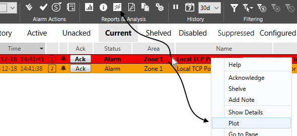 Alternatively, left-click on the alarm, then click the Plot button in the toolbar: