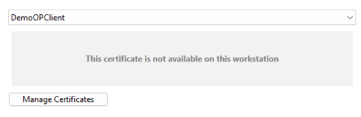 Selecting the 'Select a certificate...' field will reveal a list of available certificates from a store as determined by your application's Client / Server Configuration.