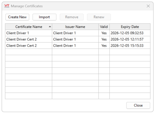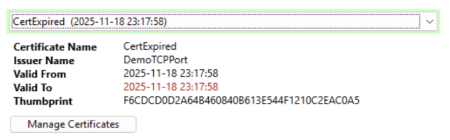 If two or more certificates possess the same name, only the certificate with the furthest expiry date will be accessible in the Droplist. If a certificate that expires sooner is required, select the 'Manage Certificates' button and delete the certificate or certificates that expire later than it does.