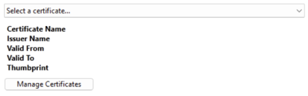 When a certificate is required for data exchange authentication, it is accessible through the Certificate Droplist. When a certificate is selected it will populate the Certificate Summary section with the certificate's name, issuer, the start of its validity window, the end of its validity window (the certificate's expiry date) and its thumbprint.