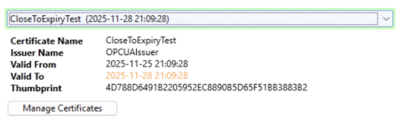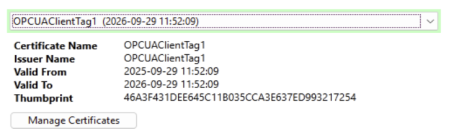 Several tabs in the OPC UA Client Driver configuration possess a Certificate Droplist, a Certificate Summary and a button that opens a 'Manage Certificates' window. It is important that you understand this tool before proceeding with configuration of the client driver. In particular, take time to review the information in the topic Certificate Name Description.