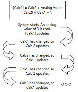 In Calc1, you suppose that you have created an expression that uses some other analog tag's value and also the value of Calc2. In Calc2, you have an expression that uses the value from Calc1. If you were working in an ordinary programming language, this would not be a problem. Your code would update Calc1, then Calc2 and then stop. But in steady state, expressions are triggered whenever any of the components change. What will happen in VTScada is: