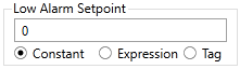 The PTypeToggle widget (following image), provides the user with a choice between a tag, a constant value, or a block of steady state VTScada code (i.e. an expression).