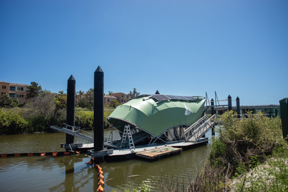 A large mechanical mollusk has finally found its home in Upper Newport Bay, where it protects the sensitive regional habitat by raking up the trash flowing downstream from the San Diego Creek and funneling it into collection bins.